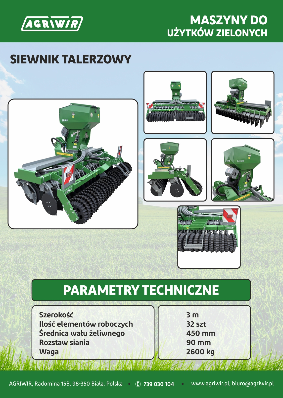Siewnik Talerzowy do użytków zielonych działa poprzez rozcinanie istniejącej darni za pomocą obracających się talerzy, tworząc miejsce do podsiewu nowych nasion.